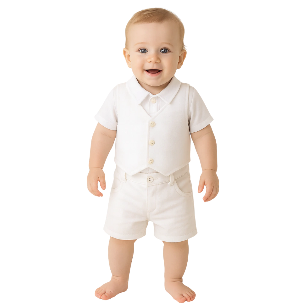 **Conjunto Social Branco para Bebê Menino – Colete + Camisa + Short – Ideal para Casamento e Batizado**